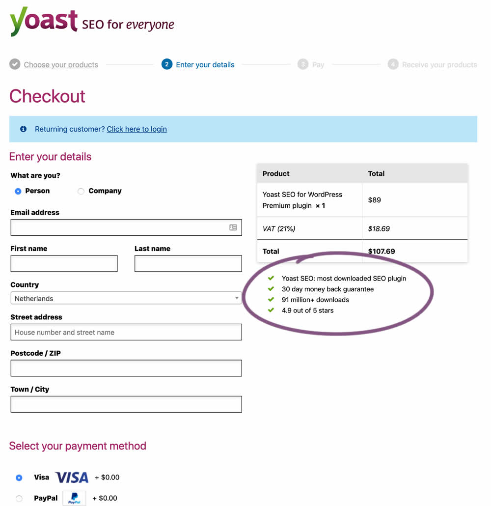 In this experiment, the Yoast team replaced one of the bulleted reassurances on their checkout page ("4.9 out of 5 stars" vs "24/7 Free support"). Raising the question - is free support or high reviews valued more? - Thanks Sjardo & Meike for sharing!