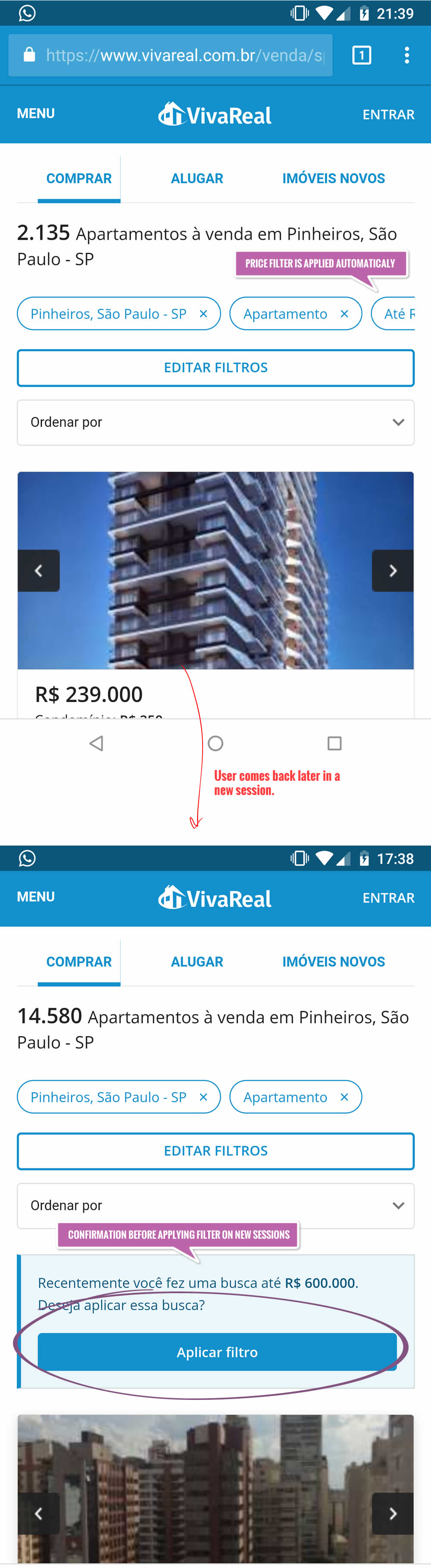 The experiment goal was automatically applying filters the users have already done in our result page, during their navigation to the site. The variation always applied the filters in the same session and asked users on new sessions.