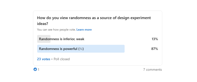 Poll 34: If you observe what experimentation leaders (Amazon, Netflix, Etsy, Bol, Airbnb, Microsoft, Walmart, Best Buy, etc.) are doing, what type of bets are you making on ideas based on their latest UI ideas and iterations? Below random, random, or above random probabilities?