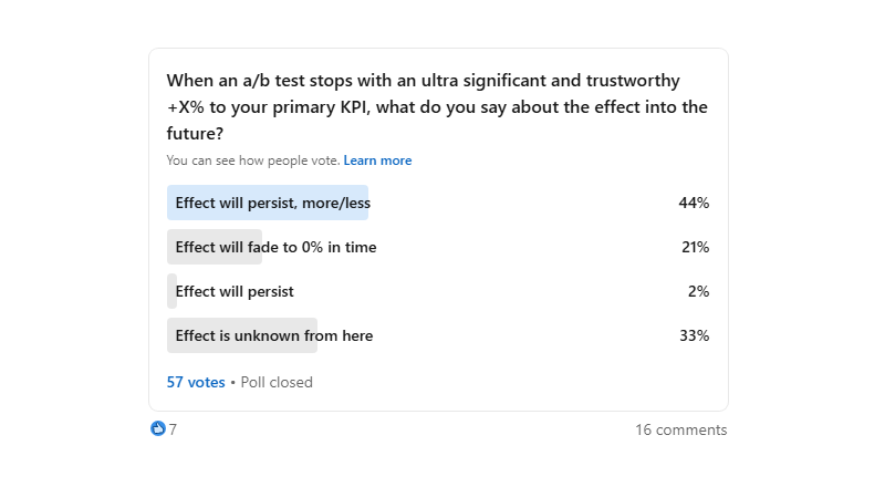 Poll 38: I'm curious what claims experimentation people make after rolling out or implementing an a/b test with some given effect. What do you say will happen to the effect in the future?