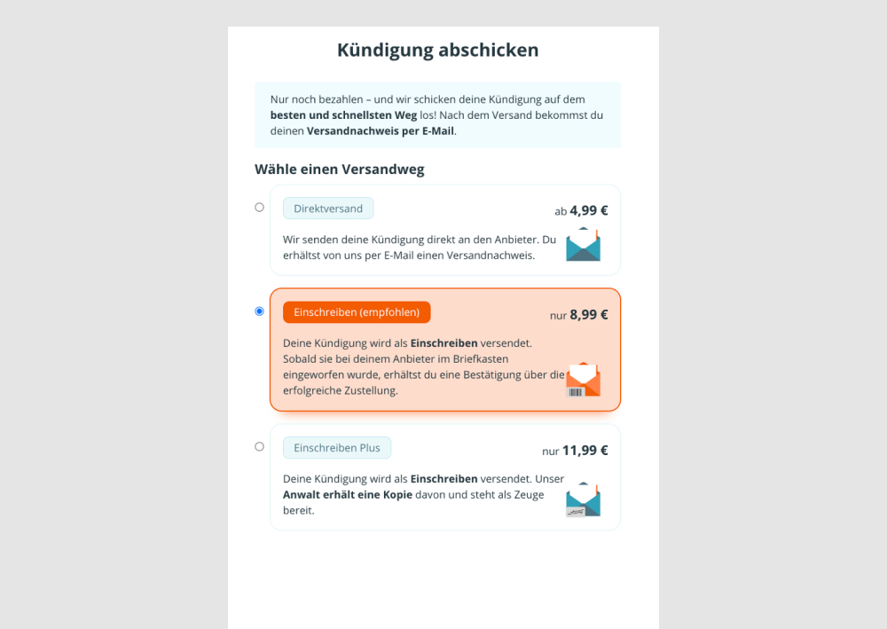 In this experiment, reassuring copy was added to 2 of 3 pricing plans of a contract cancellation service. The copy was translated as "Cancellation guarantee. Contract cost coverage and legal support included!” Impact on overall revenue was measured.